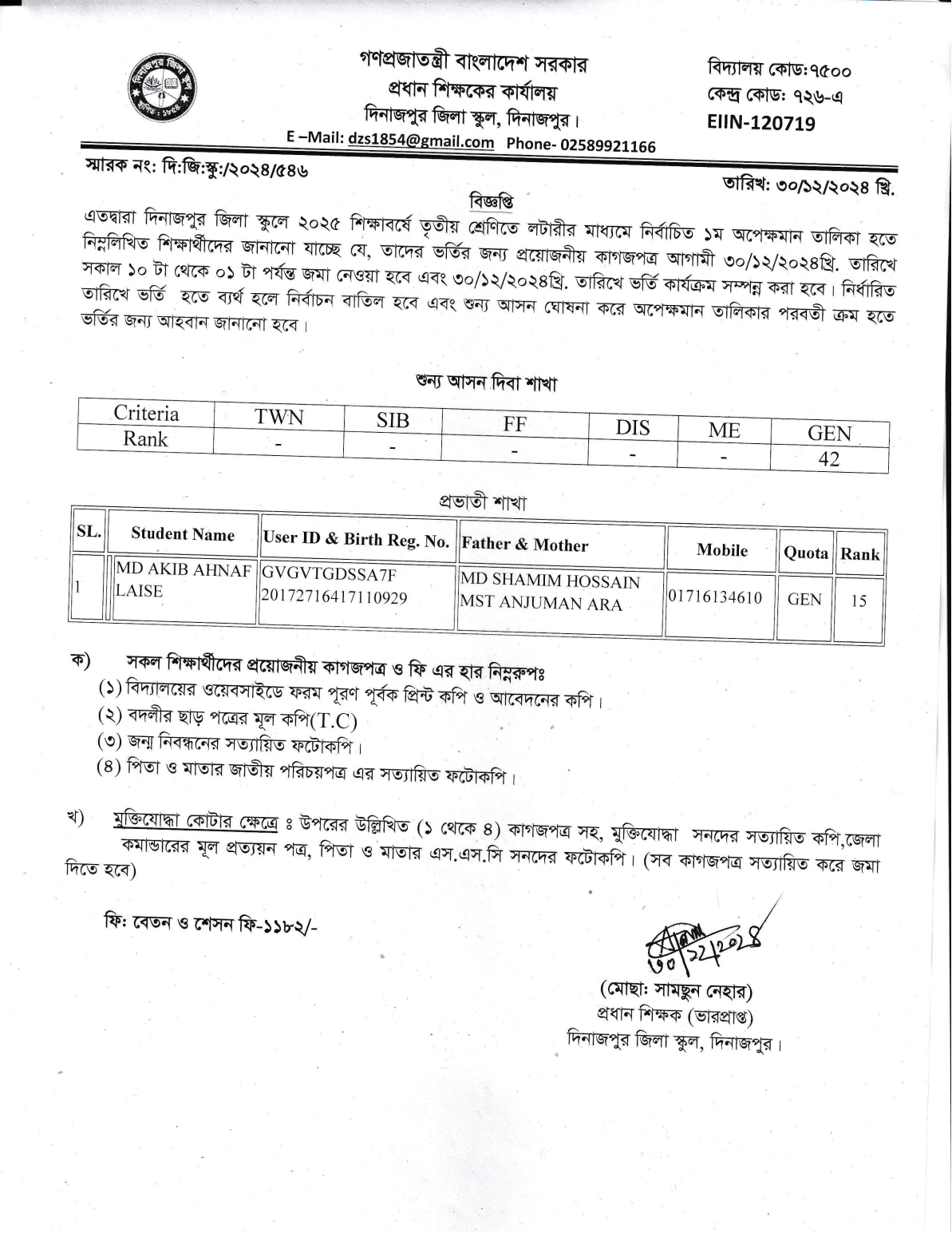 ১ম অপেক্ষমান ভর্তি সংক্রান্ত নোটিশ-২০২৫